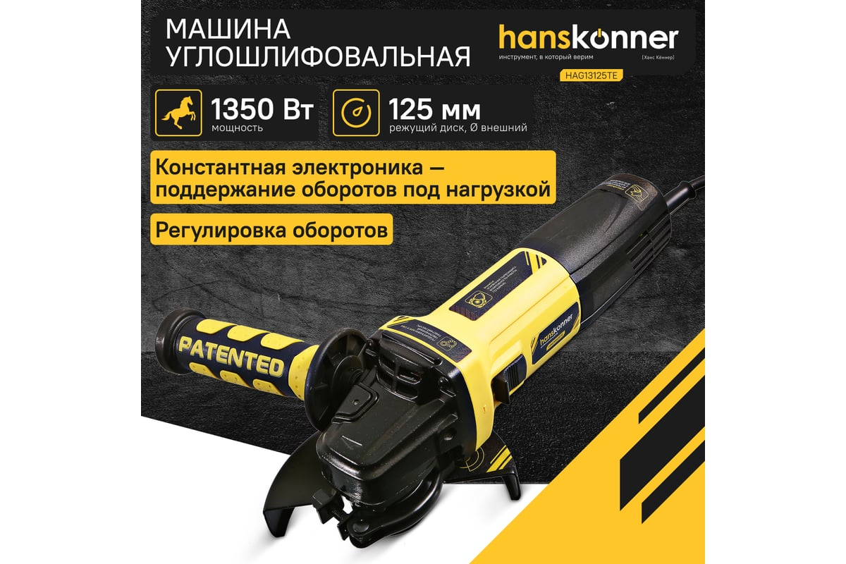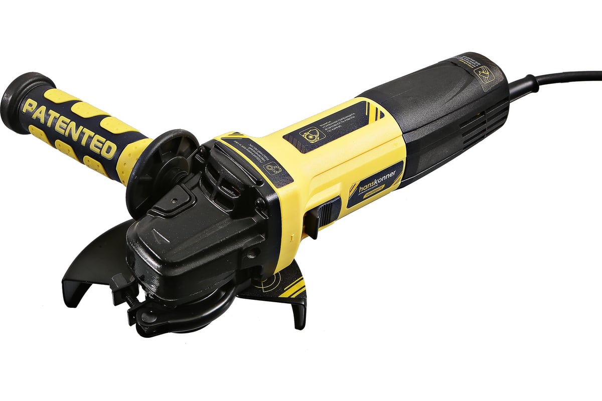 Hanskonner HAG13125TЕ – универсальная болгарка (УШМ) под рабочий диаметр диска 125 мм. Обладает оптимальными массово-габаритными показателями и выверенными пропорциями: малый диаметр корпуса гарантирует максимальное удобство хвата, нейтральный центр тяжести позволяет уверенно контролировать инструмент в процессе работы даже одной рукой, низкопрофильный корпус редуктора клиновидной формы облегчает работу в местах с трудным доступом. Главная особенность модели – наличие электронного блока EPM (Electronic Power Manager), который позволяет поддерживать стабильную частоту вращения на валу шпинделя под нагрузкой, обеспечивает плавный пуск и регулировку оборотов в широком диапазоне (4000 – 1000 об/ мин). Снабжена быстросъемным защитным кожухом FastAdapt, фиксирующимся посредством специального зажимного рычага, за счет чего возможна быстрая смена положения кожуха без помощи вспомогательного инструмента, а также удобной патентованной рукоятью со специальным твердосплавным карандашом для нанесения разметки на поверхности любой сложности, включая ржавые, влажные и маслянистые.