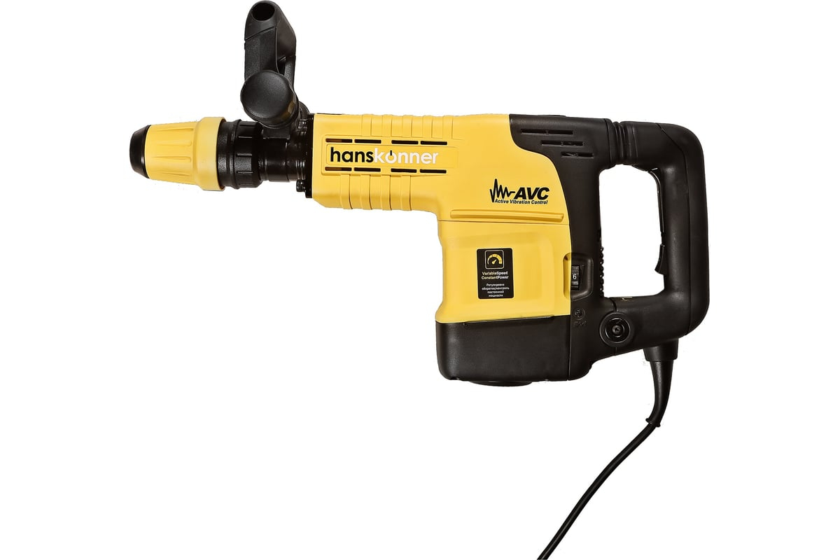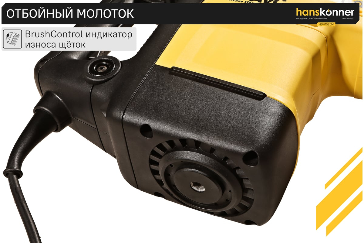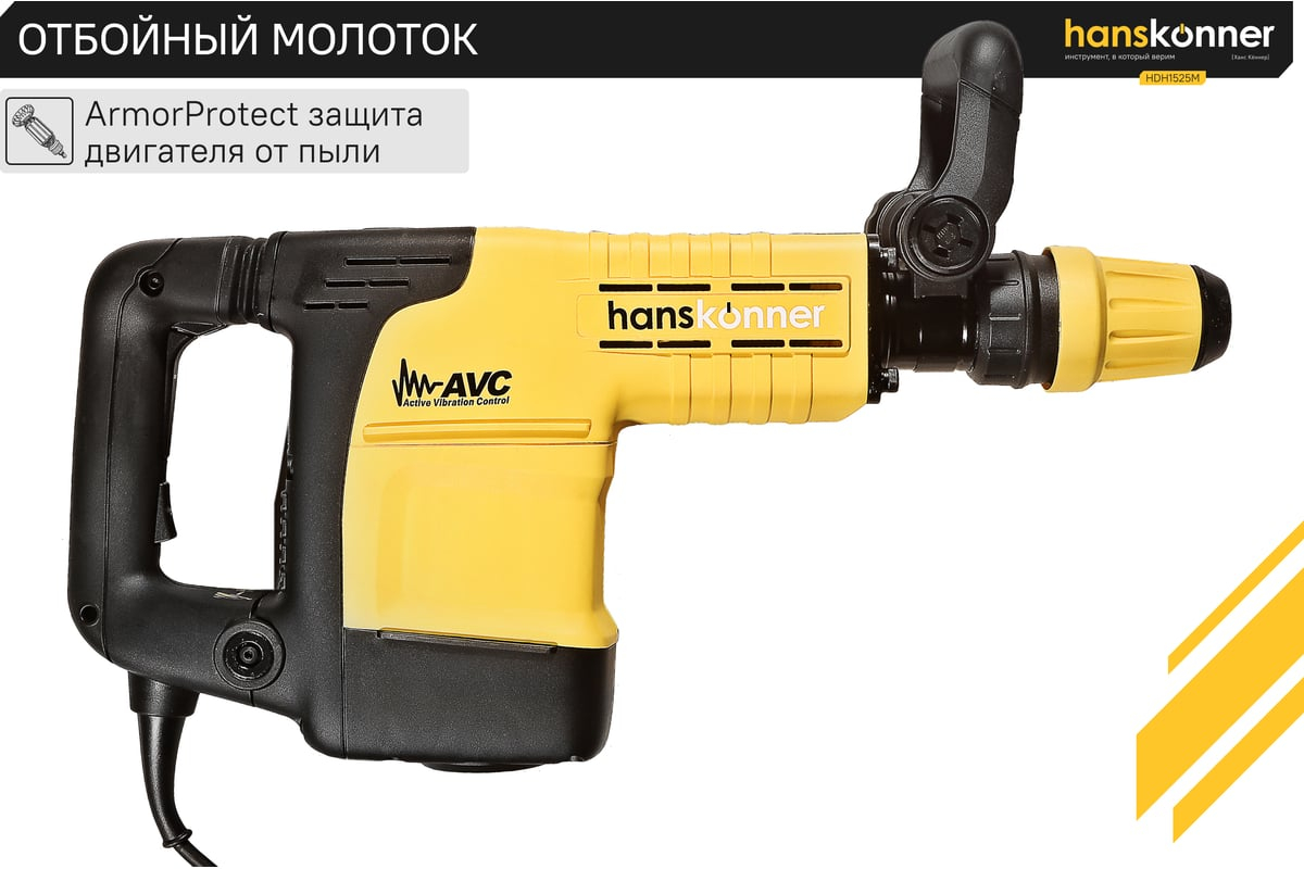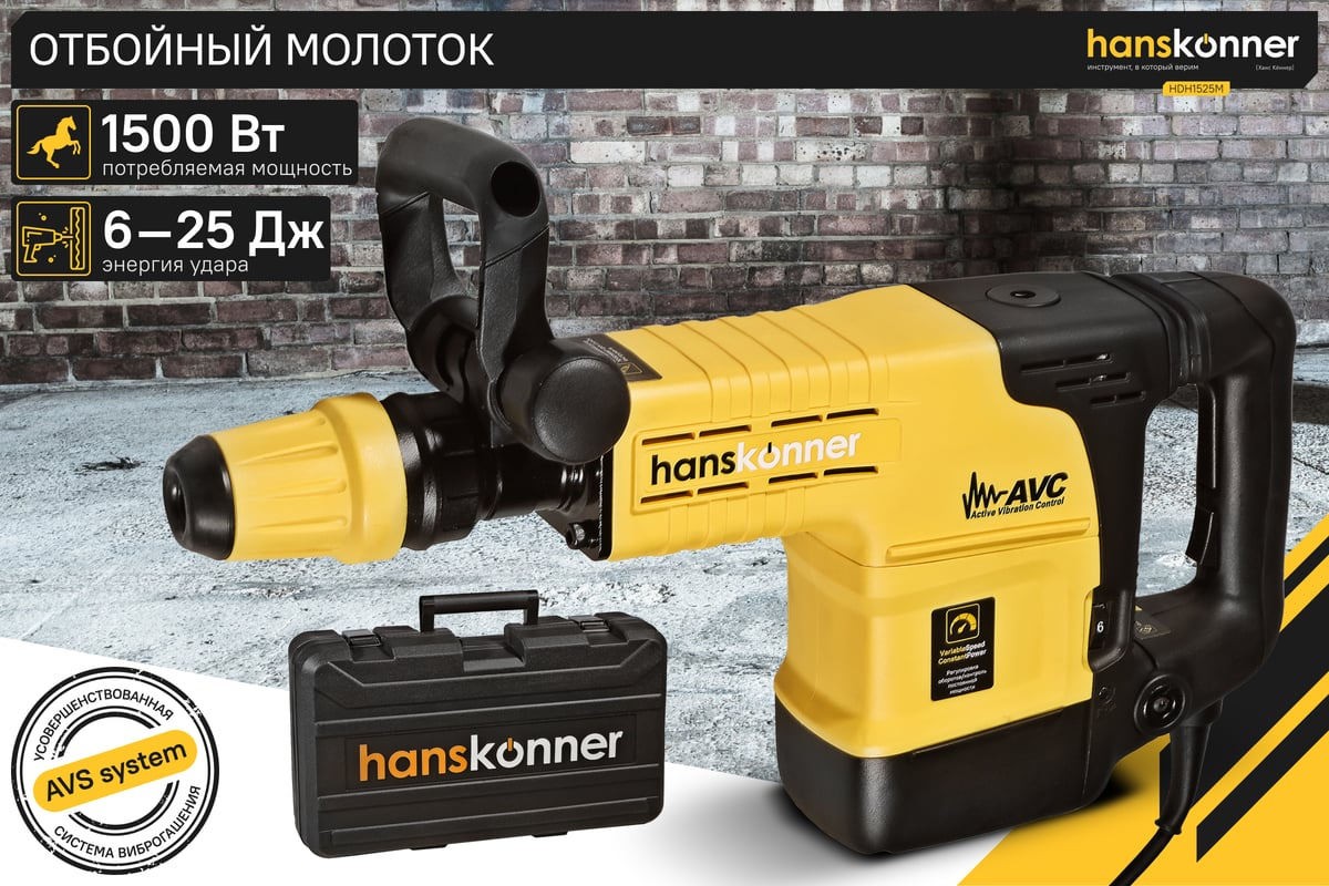 Отбойный молоток Hanskonner HDH1525M — мощный и практичный электроинструмент для разрушения конструкций из бетона, железобетона, кирпича и камня, дробления асфальтовых, бетонных и плиточных покрытий. Оптимальной настройке к проведению конкретной задачи содействует электронная регулировка оборотов, а контроль постоянства мощности способствует продуктивному выполнению работ. Модель отличается встроенной системой виброгашения «AVS-system», которая поддерживает удобство и безопасность при использовании молотка.