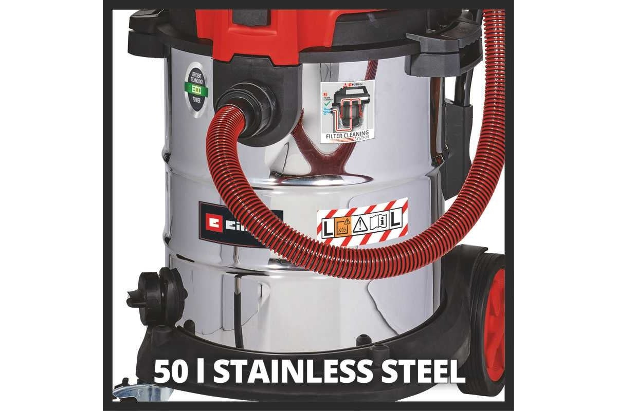 Пылесос строительный для влажной и сухой уборки Einhell TE-VC 2350 SACL имеет инновационную систему очистки фильтра от пыли класса L, которая эффективного удаляет, как и крупные частицы, так и микрочастицы грязи и пыли. Объем бака из нержавеющей стали составляет 50 литров. Также у пылесоса имеется функция выдувания для быстрой очистки всасывающего шланга или удаления мусора из труднодоступных мест. Для удобной работы предусмотрены два больших и два роликовых колеса, а также ручка для перемещения и держатель кабеля на корпусе. Для слива жидкости в баке предусмотрен дренажный клапан. На ручке установлен регулятор воздушного потока. Пылесос укомплектован телескопической трубкой из нержавеющей стали, сверхпрочным пластиковым всасывающим шлангом длиной 3 м, комбинированной насадкой, щелевой насадкой, пылесборником, гофрированным HEPA-фильтром и поролоновым фильтром. В корпус встроена розетка для инструмента с синхронным стартом.