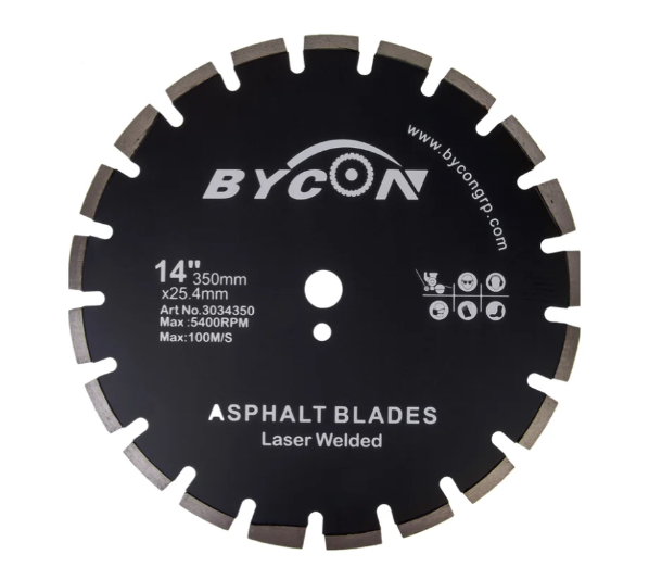 - алмазные сегментные диски BYCON LASER ASPHALT применяются на швонарезчиках, камнерезныx станках, бензорезах (Stihl (Штиль), Husqvarna (Хускварна), Makita (Макита), Messer (Мессер), Wacker Neuson, Solo, Echo и др.), электрических резчиках и малых швонарезчиках (Masalta, Grost, Калибр, Зубр, Сплитстоун, Diam и др.). Обрабатываемые материалы: мягкий силикатный кирпич, цементная стяжка, абразивный бетон, асфальт, песчаник и другие абразивы;