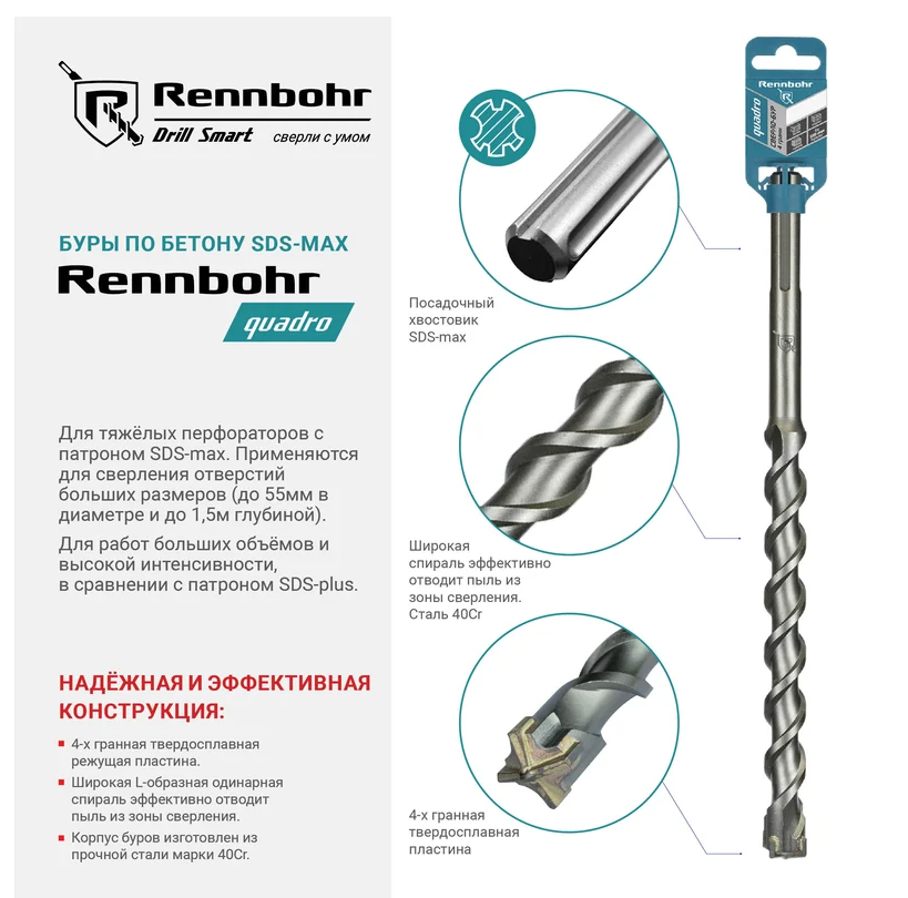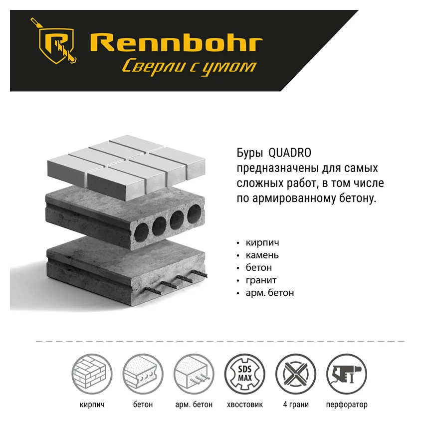 Линейка буров RENNBOHR Quadro с 4-х гранной твердосплавной режущей пластиной с хвостовиком SDS-max для профессиональной работы любой сложности по камню и бетону (в т.ч. армированному).