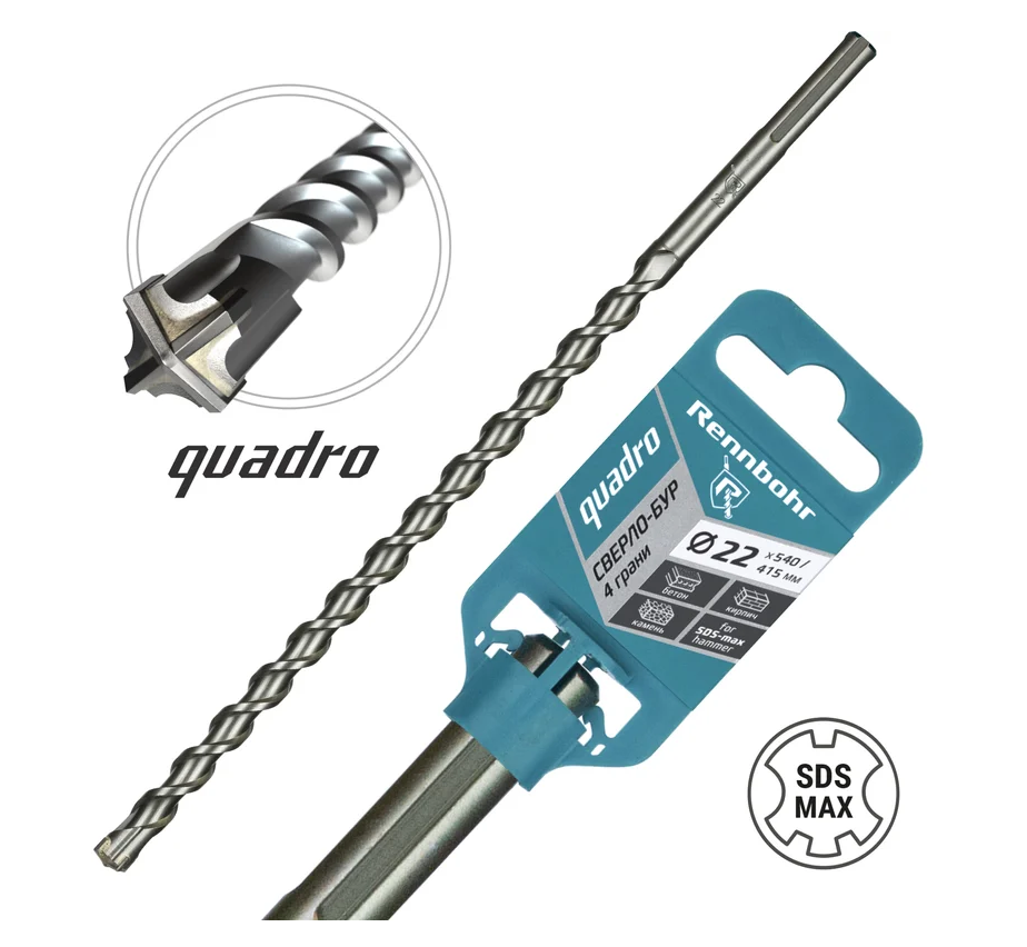 Бур по бетону RENNBOHR Quadro SDS-Max 4 грани 22x540/415 мм 722254